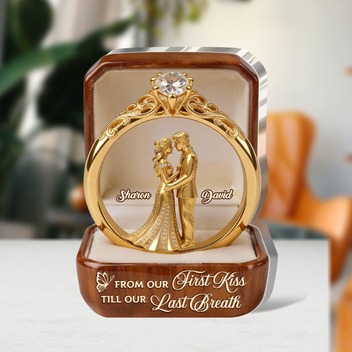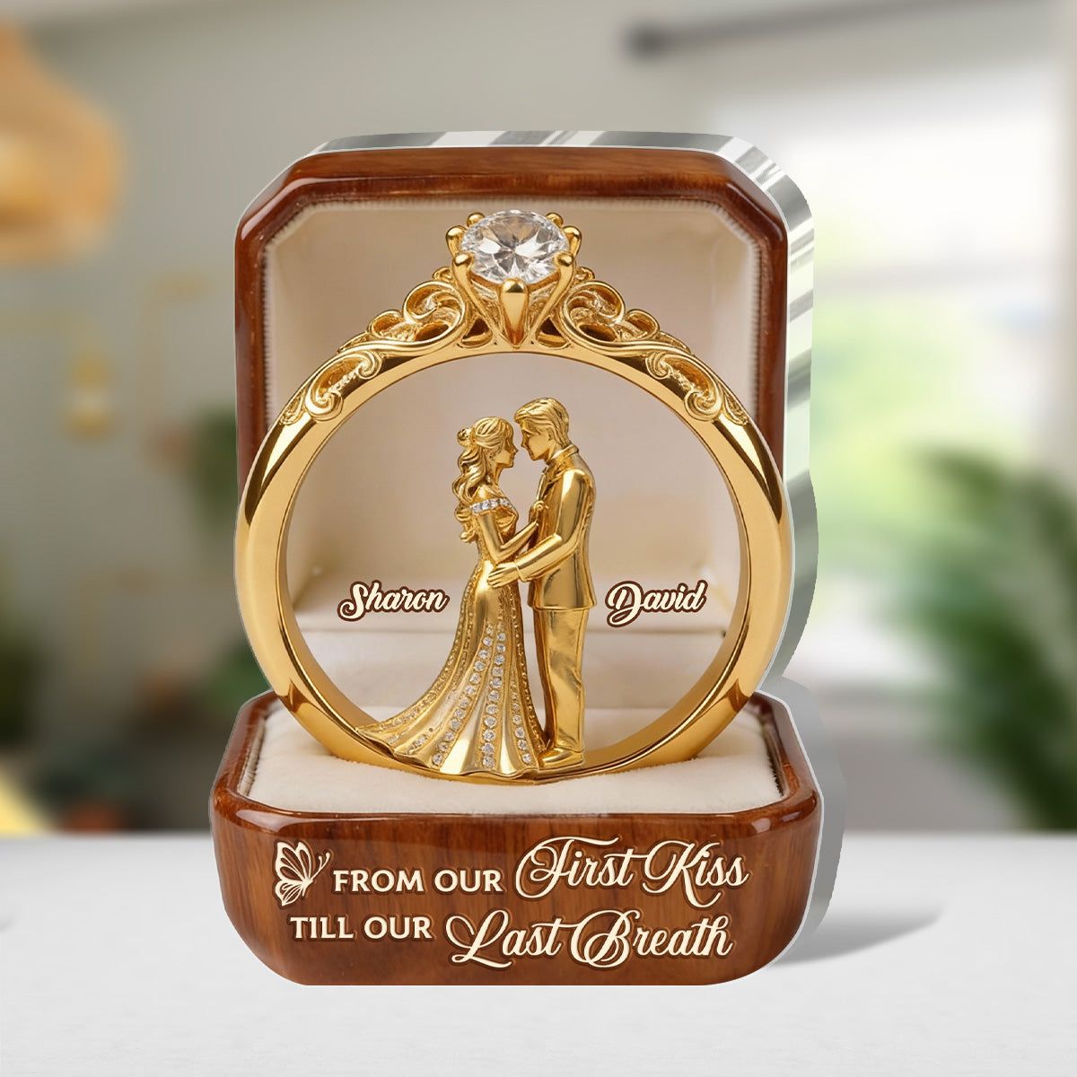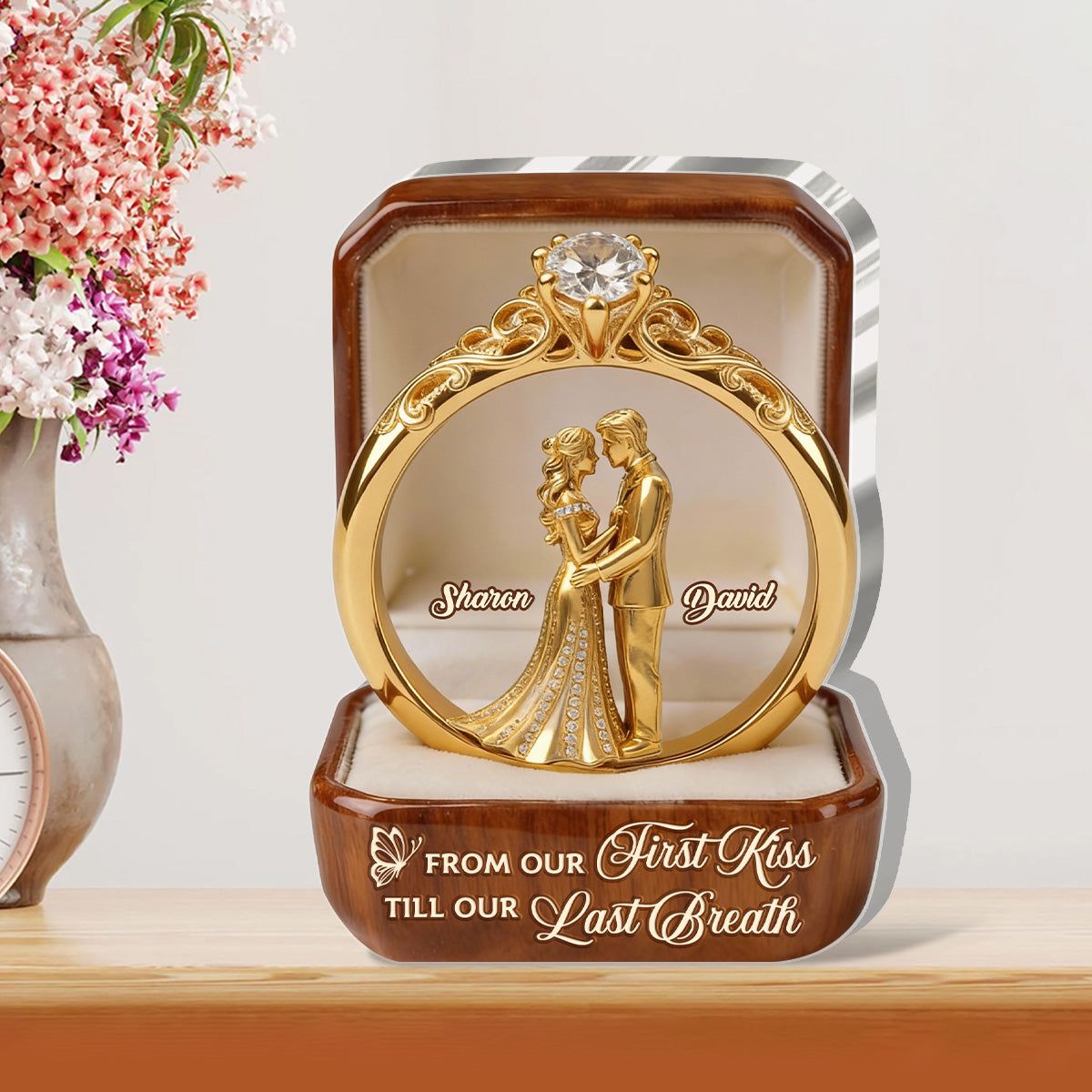 A ring that holds your names, your vows, and the promise of forever — from your first kiss to your last breath.